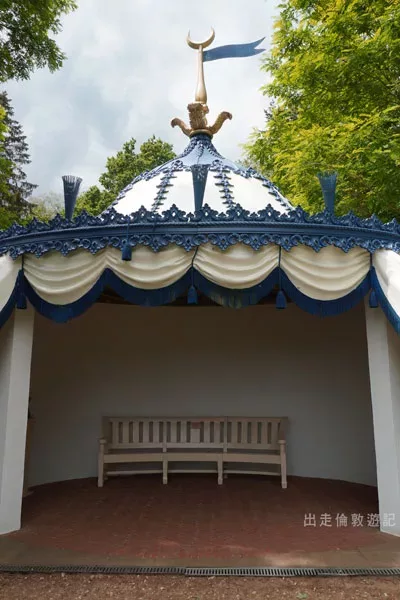 這座帳篷建築的設計靈感來自18世紀的奢華東方風格,位置優越,能夠俯瞰蛇形湖及周圍美麗的風景。內部以鮮豔的圖案和布料裝飾,營造出一個理想的休憩和觀景場所。而且這裡也非常適合拍照呢~