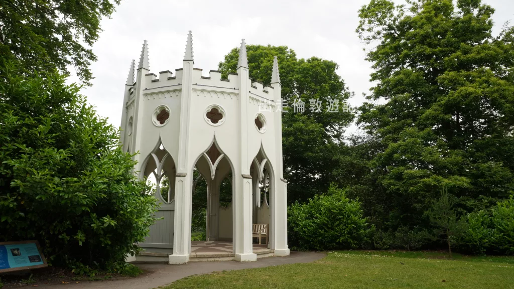 這座八角形的哥特式建築位於公園的一處高點,是眺望全園風景的絕佳位置。建築特色包括尖頂設計和拱形窗戶,展現出浪漫時期對哥特風格的喜愛與追求。由於其獨特外觀和位置優勢,這裡經常被用作婚禮場地或攝影取景點,也是不少遊客駐足留影的熱門地點。