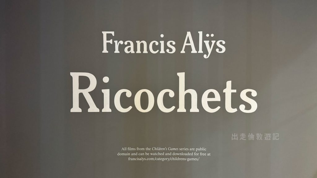 這次展覽「Ricochets」在Barbican展出,是一個探索遊戲、童年、與城市空間的互動性展覽。「Ricochets」這個展覽名稱本身意為「反彈」,暗示著作品中的一種反覆的動力,他的作品常涉及遊戲中簡單的行為,如拋石頭、踢球等,這些動作在不同的文化和社會背景中產生了共鳴。展覽展示了Alÿs 如何通過這些兒童遊戲來反映和質疑社會、政治和經濟的現實,並探索人類在面對困難時的創造力和韌性。